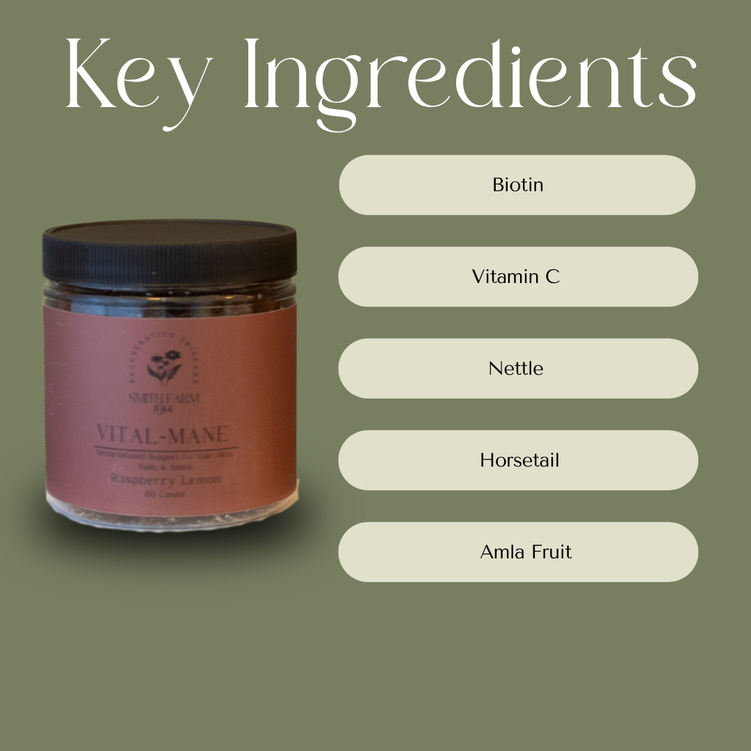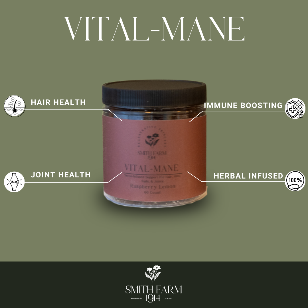 Vital Mane is more than just a beauty gummy—it's a deep-rooted wellness formula crafted for hair, skin, nails, joints, and immune support. Each gummy is packed with nature-backed herbs. Herbs like:
